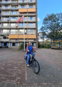 ”Ik werk al bijna 20 jaar in de wijkzorg en ga door weer en wind op de (gewone) fiets naar mijn cliënten. Ik ben niet in het bezit van een rijbewijs. Vrienden en familie zeggen weleens: ‘Zou je die nou niet eens halen, als het weer niet meezit?’ Fietsen geeft mij voldoening en is ook nog eens goed om fit te blijven.”